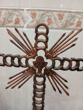 Cruz decorativa de hierro con un diseño de resplandor. - Fabricada en hierro. - Diseño con rayos. - Base cuadrada. Hierro envejecido Totalmente artesanal