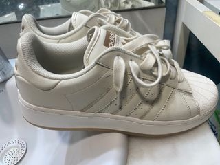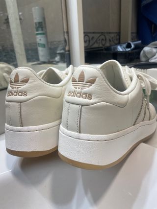 Zapatillas deportivas Adidas Superstar de color blanco y suela marrón. - Diseño clásico con las tres franjas. - Puntera de concha. - Cordones blancos.