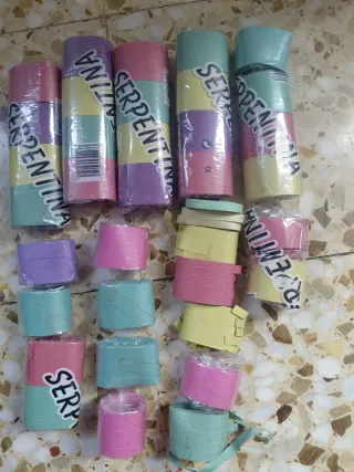 Pack de serpentinas de colores variados, perfectas para decorar y animar cualquier celebración. - Serpentinas enrolladas en rollos. - Colores disponibles: rosa, morado, amarillo y verde.Alguna esta sin bolsa,se ve en la segunda foto las que estan sin bolsa.