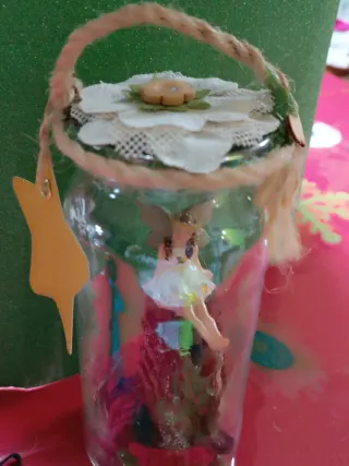 Precioso tarro decorado con un hada pintada a mano. Ideal para un regalo especial o para darle un toque mágico a tu hogar. - Tarro de cristal. - Figura de hada. - Decoración artesanal.