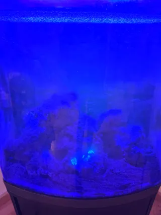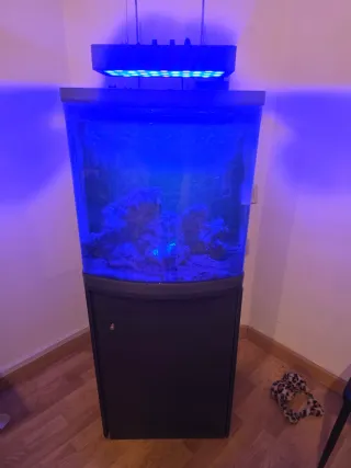 Acuario completo con mueble y luz LED. - Iluminación LED azul. - Mueble negro. - Decoración interior incluida.