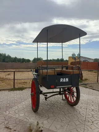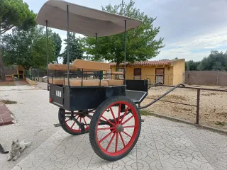 Carro Sanluqueño con 5-6 plazas. Frenos de disco. Dos neveras y arcón para arreos. Suspensiones de lanza y de carro. Tiene el toldo roto, hay que poner la tela nueva.