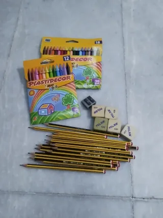Lote de material escolar que incluye lápices, pinturas y gomas de borrar. - Caja de 12 pinturas PlastiDecor BIC. - Caja de 18 pinturas Decor. - Lote de 18 lápices de madera. - Gomas de borrar Milan (5 unidades).