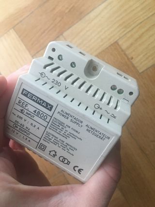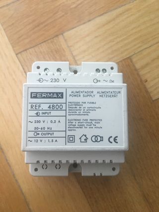 Fuente de alimentación Fermax modelo 4800. - Entrada: 230 V, 0,2 A, 50-60 Hz. - Salida: 12 V, 1,5 A. - Protección electrónica por fusible.