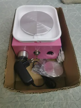 Se vende torno eléctrico para cerámica en color rosa. Incluye plato puesto en la maquina de 10 CM y otro mas pequeño de 6 CM, llave allen, 8 lapices para moldear o dibujar y también el adaptador de corriente. - Plato giratorio de aluminio - Plato de 10 CM y de 6 CM. - Bandeja de plástico blanco. - Interruptor de encendido/apagado. - Control de velocidad con dial.