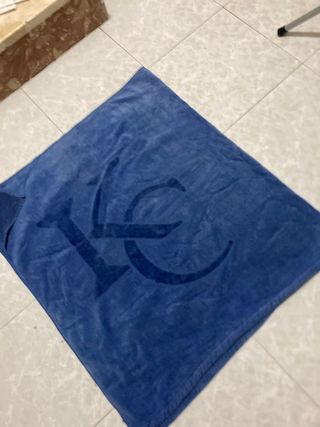 Toalla de baño de la marca Calvin Klein en color azul. Presenta un diseño con las iniciales KC en relieve. - Color: Azul. - Logo: KC en relieve.