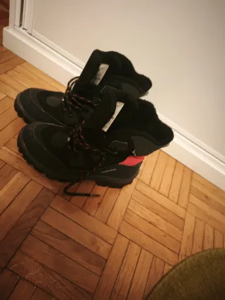 Botas de montaña Quechua en color negro. Perfectas para senderismo y actividades al aire libre. - Exterior de ante y material sintético. - Forro interior cálido y confortable. - Suela de goma antideslizante. - Cierre con cordones.