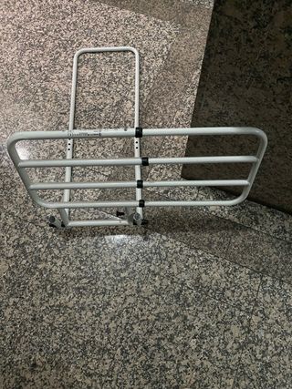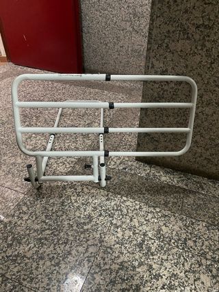 Barra de seguridad metálica para cama, diseñada para proporcionar soporte y prevenir caídas. - Estructura de metal blanco. - Barras horizontales de soporte. - Ajustable en altura.