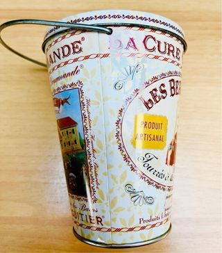 Bonita lata metálica vacía de la marca francesa La Cure Gourmande. Ideal para decoración o manualidades. - Lata de metal con diseño vintage. - Perfecto estado, sin golpes ni abolladuras. - Medidas aproximadas: 10cm de alto x 7cm de diámetro (puede variar ligeramente).