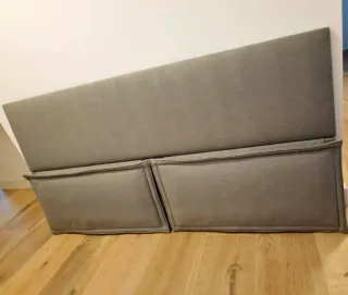 Cabecero Stefany tapizado en tela gris, con un diseño moderno y elegante. Los cojines inferiores son desmontables, lo que facilita su limpieza y versatilidad. - Tapizado en tela gris. - Cojines inferiores desmontables.