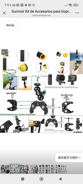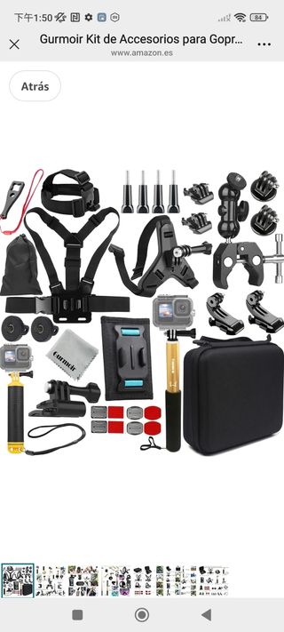 Kit de accesorios Gurmoir para GoPro, en buen estado. Incluye: - 1 arnés para el pecho. - 1 soporte para casco. - 4 tornillos. - 2 soportes para cámara. - 1 mini trípode. - 1 abrazadera. - 2 soportes adicionales. - 1 palo selfie. - 1 funda protectora. - 1 paño de limpieza. - 2 bases adhesivas. - 1 correa de muñeca.