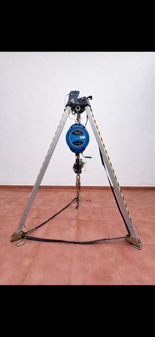 Trípode diseñado para trabajos en espacios confinados. Cuenta con un sistema de polea y anclaje. - Estructura de aluminio resistente. - Polea azul con sistema de retracción. - Anclajes de seguridad en las patas.