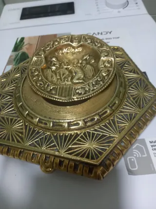 Cenicero vintage de latón con un diseño intrincado y detalles en relieve. - Material: Latón - Diseño: Escena con figuras en relieve - Base octogonal con patrón geométrico Recoger en Torremolinos