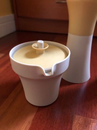 Conjunto de dispensadores de plástico en tonos blanco y amarillo, con un diseño retro. Aceitera y vinagrera - Dos dispensadores altos. - Dos dispensadores bajos. - Tapas con botón. - Diseño cónico y cilíndrico. - Tupperware