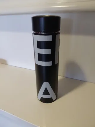Termo reutilizable de color negro con un diseño moderno. Presenta letras grandes en color gris. - Tiene filtro para hacer té. - Diseño con letras. - Color negro y gris.