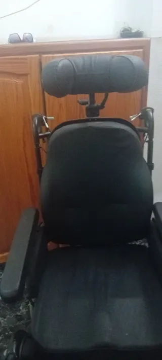 Silla de ruedas con respaldo alto y reposacabezas. - Asiento y respaldo acolchados. - Reposabrazos. - Estructura metálica.