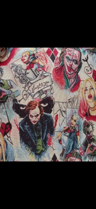 Sólo envío Tela con diseño inspirado en Joker y Harley Quinn, ideal para tapizar o decorar bolsos mochilas..etc Ancho 1.40 x 0.50metro = 5 euros posibilidad de más Tejido con cuerpo - Colores vibrantes y detallados. - Tejido resistente para tapicería. Palabras clave retal tapizado chollo chalk Paint tela tejido bonito muebles