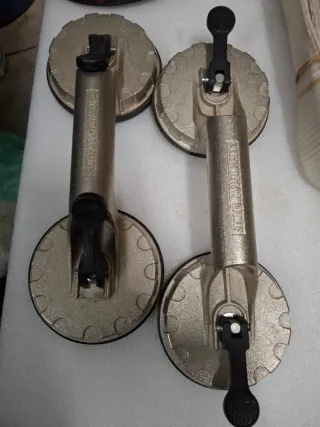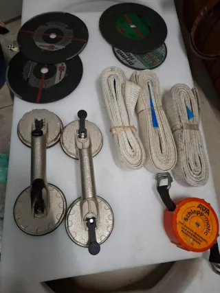 Lote variado de herramientas y accesorios. - Discos de corte para radial. - Cincha de sujeción. - Ventosas para elevación. - Carrete de cinta con trinquete.