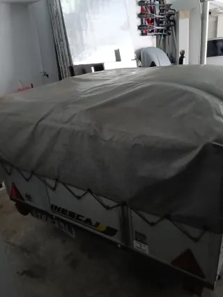 Carro tienda INESCA dos habitaciones de matrimonio, arcones debajo de los asientos, avance bastante grande, arcón grande y base para poner nevera, documentación en regla, impermeabilizado el año pasado - Lona gris. - Estructura metálica.
