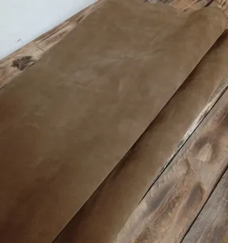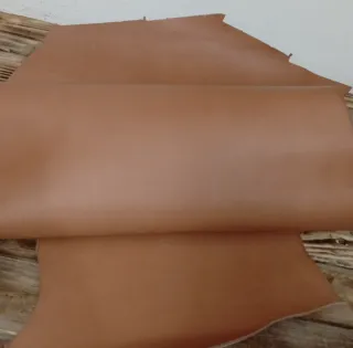 Pieza de piel de vaquetilla, ideal para trabajos de marroquinería y artesanía. Medidas 130 de largo y de ancho de 28 a 40 Grosor 1.5 a 1.6 milímetros Es un poco acartonada - Color marrón - Textura lisa y uniforme