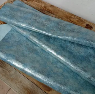 Pieza de piel de vacuno con un diseño texturizado que imita escamas. Medidas 130 de largo y de ancho de 55 a 65 Grosor 1 milímetros aproximado Es más bien manejable - Color azul con acabado metalizado. - Textura de escamas. - Material: Piel de vacuno.