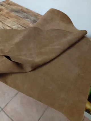 Material de piel serraje en tono marrón. Medidas 100 de largo y de ancho de 50 a 75 Grosor 1.5 Es manejable, pero no muy blanda Lleva un agujero donde se ve - Textura suave y aterciopelada. - Color marrón