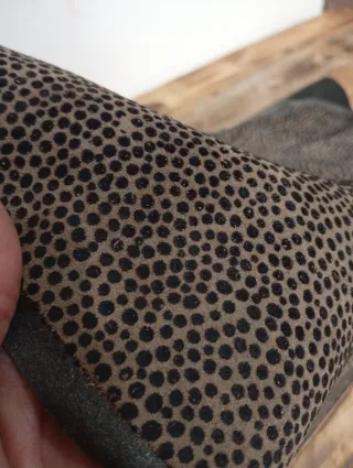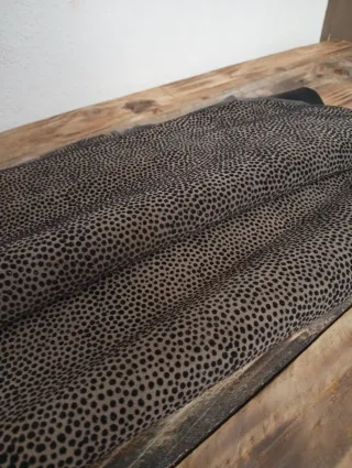 Retal de piel con un diseño de puntos negros sobre fondo beige. Los puntos son abultados Terminación aterciopelada Lleva refuerzo una tela pegada por detrás Medidas 80x40 Grosor 1.1 milímetros aproximado Es manejable - Estampado de puntos. - Material: Piel.
