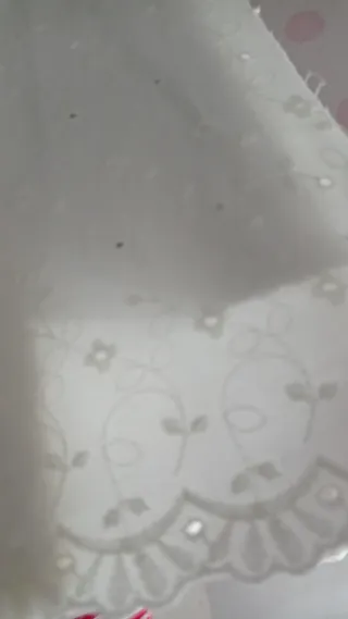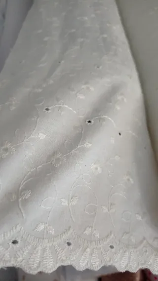 Tejido de batista bordada con un pequeño calado y un delicado diseño floral ,muy dulce .ideal para vestidos de infantil o blusas de zíngaro de festividades de moros,lleva ondas en las terminaciones 1.40 *1 metro 10 euros posibilidad de más metros - Patrón de flores y hojas.disponible en varios colores rojo beige celeste... preguntar - Borde festoneado Palabras clave dulce retal tapizado chollo chalk Paint tela tejido bonito muebles