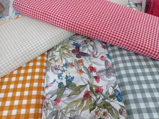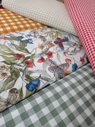 Conjunto de 5 telas de lonetas con diferentes diseños, perfectas para manualidades y proyectos de costura ancho 1.40 cm -1 Loneta de cuadros Vichy en color rojo y blanco.1 metro - 2Loneta de cuadros Vichy en color beige.1 metro - 3Loneta de cuadros Vichy en color mostaza.1 metro - 4Loneta con estampado floral y mariposas.1 metro 5-Loneta Vichy verde y blanco 1 metro