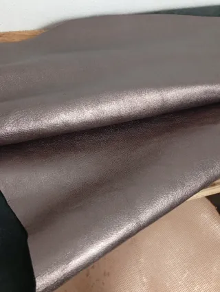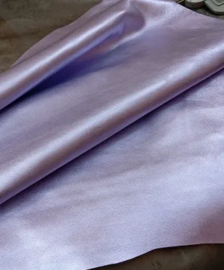 Pieza de piel de cabra con acabado metalizado en tono lila. Es manejable Medidas 75 de largo y de ancho de 53 a 65 grosor 1 milímetros El color no sale exacto - Material: Piel de cabra. - Color: Lila metalizado.