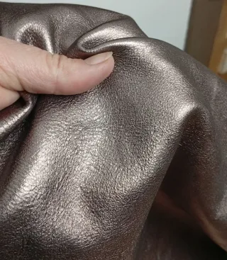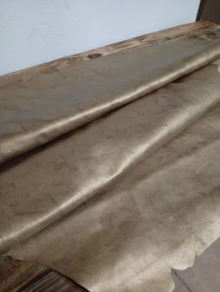 Material de piel de cabra con un acabado metalizado Color bronce Es manejable Medidas 75x60 aproximado Grosor 0.9 milímetros Es manejable - Textura suave y flexible. - Color bronce