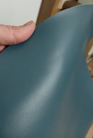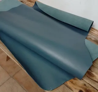 Pieza de piel de vacuno de color azul. Lleva un agujero y un pequeño daño se ve en las últimas fotos Medidas 115 de largo y de ancho de 45 a 80 Grosor 1.4 a 1.5 milímetros Es un pelín acartonada - Material: Piel de vacuno. - Color: Azul.