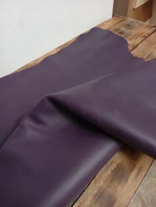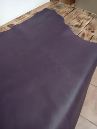 Retal de cuero vacuno con acabado encerado. Medidas 80x70 Grosor 1.4 milímetros Es manejable Lleva algún daño del propio animal - Color morado intenso. - Textura suave y flexible. - Ideal para proyectos de marroquinería.