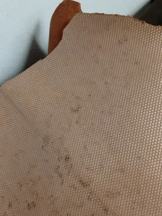 Material de piel de vacuno en tono marrón. Presenta un relieve cuadriculado. Medidas 90 de largo y de ancho de 45 a 95 Grosor 1.2 milímetros Lleva algún daño como se ve en las últimas fotos Ni muy blanda,ni rígida - Textura con patrón de pequeños cuadrados. - Acabados texturizada