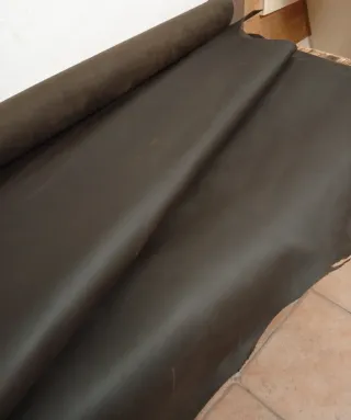 Material de piel de vacuno. Color marrón muy oscuro Encerada o con un poco de grasa Es manejable Medidas 110 de largo y de ancho de 65 a 110 Grosor 1.5 milímetros - Color marrón oscuro. - Textura suave.