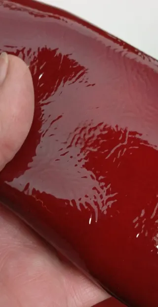 Retal de material con acabado charol en color rojo granate Es un poco arrugadita Lleva un agujero donde se ve Medidas 70x50 centímetros Grosor 1.3 milímetros Es más bien manejable - Superficie brillante. - Textura rugosa