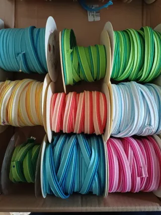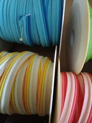Lote de 9 rollos de vivos o cordones. - Colores variados: azul, verde, amarillo, naranja, rosa y blanco. - Ideal para manualidades y costura.