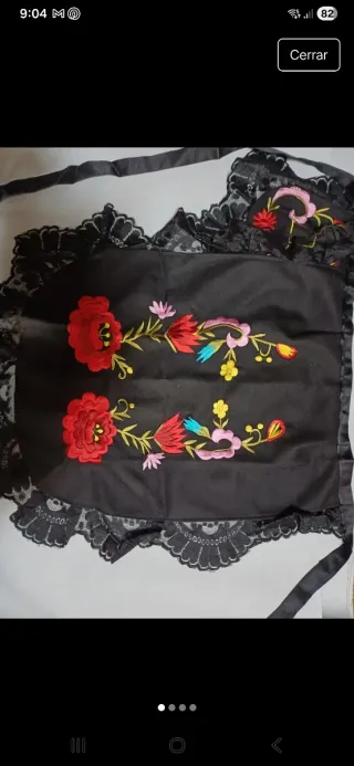 Delantal regional negro con bordados florales en tonos rojos, rosas, amarillos y azules. Los bordados presentan dos grandes flores rojas en la parte superior y un diseño floral más pequeño en la parte inferior. - Ribete de encaje negro. - Lazos negros para atar.