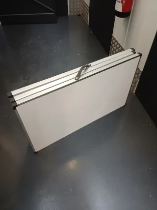 Mesa plegable con estructura de aluminio. - Superficie blanca. - Asa para transporte. -3 meyros de larga (abierta) y 70cm ancho.
