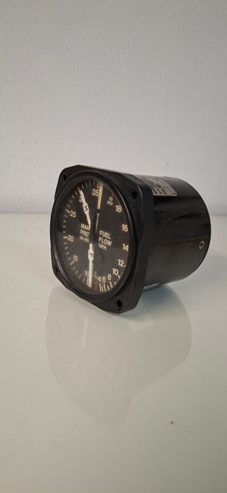 Indicador dual para aeronaves, mostrando la presión del colector y el flujo de combustible. - Indicador de Presión del Colector (Man Press) en IN/HG. - Indicador de Flujo de Combustible (Fuel Flow) en GPH. - Marcaciones claras y agujas visibles para lecturas precisas. Solo es para decoración. Es un elemento no serviciable y no se puede utilizar en vuelo. Tengo más instrumentos similares en mi perfil. Instrumento de vuelo, avion, cessna, decoración avion, panel avion, instrumentos Aeronave