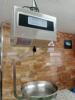 Balanza de colgar de acero inoxidable, ideal para pesar productos....digital...peso hasta 15 kgr Perfecto estado y funcionamiento. - Plato de gran capacidad. - Estructura robusta.