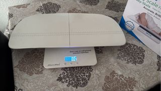 Balanza digital MomMed para pesar bebés. Incluye cinta métrica integrada. - Diseño blanco. - Pantalla digital. - Cinta métrica en la superficie.