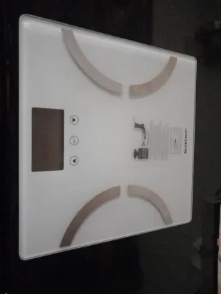 Balanza digital con conexión Bluetooth para sincronizar con tu teléfono. - Máximo de peso: 180 kg. - Precisión: 50 g. - Instrucciones de uso incluidas.