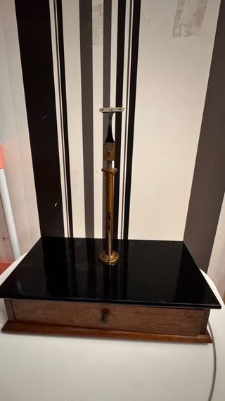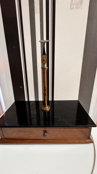 Balanza antigua de precisión con base de madera y detalles dorados. - Base de madera oscura. - Soporte metálico dorado. - Plato superior metálico. - faltan solo una pieza