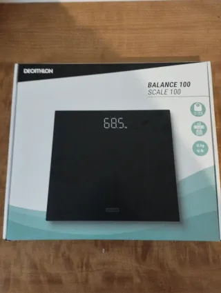 Balanza digital de la marca Decathlon, modelo Balance 100. - Diseño moderno y compacto. - Pantalla digital clara. - Superficie de cristal negro.