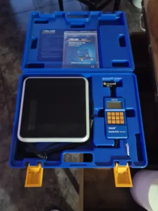 Balanza digital Value para refrigeración, ideal para trabajos con gases refrigerantes. Se presenta en un maletín azul para su transporte y protección. - Maletín de transporte azul. - Pantalla digital. - Teclado numérico.