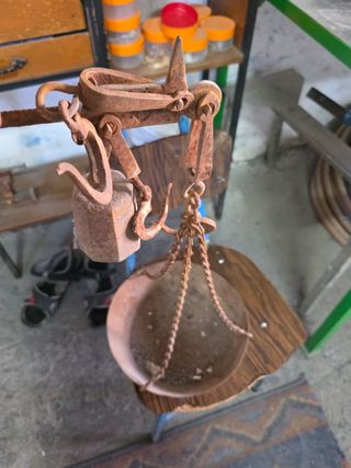 Son 3 Balanzas romanas antiguas de hierro oxidado. Ideal para decoración o coleccionistas. - Antigua balanza de estilo clásico. - Material: Hierro. - Presenta señales de óxido y desgaste por el paso del tiempo. Precio por unidad
