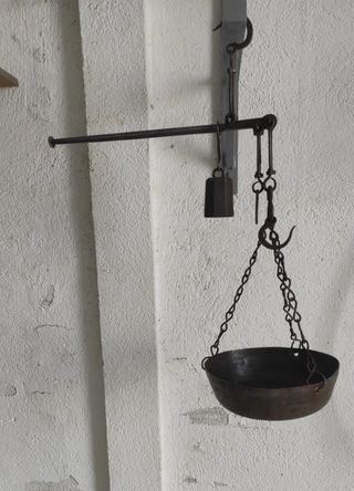 Balanza antigua de tipo romana, con un diseño clásico y robusto. Ideal para coleccionistas o como elemento decorativo. - Estructura de metal oxidado. - Incluye pesa. - Ganchos para colgar.