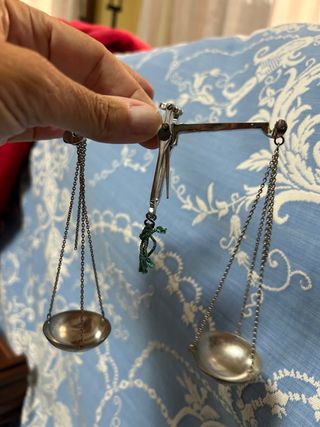 Balanza antigua de precisión con base de madera y detalles dorados. - Base de madera oscura. - Soporte metálico dorado. - Plato superior metálico. - faltan solo una pieza