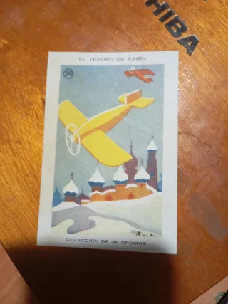 Cromo de la colección El Tesoro de Rabin, número 20. - Ilustración de aviones y edificios nevados. - Colección de 36 cromos. - Firma del autor Ruiz visible.